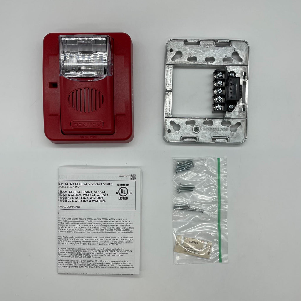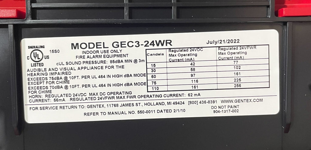 Gentex GEC3-24WR 24VDC Selectable Candela Low Profile Evacuation Horn Strobe Red Faceplate